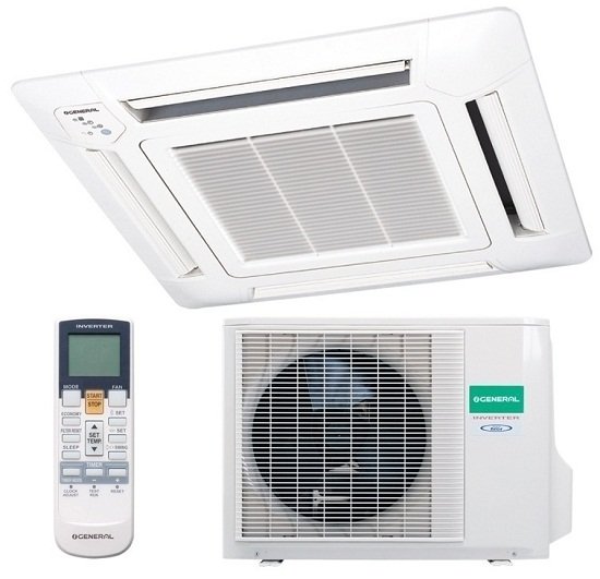 AUHG24L – это высокоэффективный кассетный кондиционер от компании General, работающий на основе инверторной технологии. Данная модель работает в режимах: охлаждение, обогрев, осушение повышенной влажности и вентиляция. Кроме того, есть функции теплого пуска, ночной и автоматический режимы. Кроме того, возможен подмес свежего воздуха, взятого с улицы. Для удобства использования предусмотрен пульт дистанционного управления, оснащенный дисплеем.